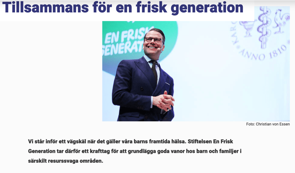 Är stolt över att officiellt tillträda styrelsen för organisationen En Frisk Generation vars verksamhet bidrar till att bryta trenden med ojämlik hälsa genom att ge unga och familjer möjlighet till en aktiv gemenskap i områden där behoven är som störst. H.K.H Prins Daniel från Kungahuset är beskyddare och ingår även i styrelsen.