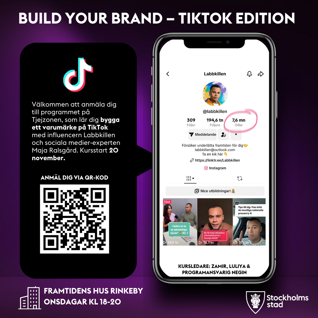 Under hösten har SVT dokumenterat mitt arbete tillsammans med Sveriges största skolinfluencer Labbkillen (Emanuel Behi Åkesson) och sociala medier-experten Maja Ralsgård, där vi tagit fram varumärkesprogrammet ”Build Your Brand – TikTok Edition” för ungdomar mellan 16–19 år från Järva. Arbetet har skett i Rinkeby på ungdomsverksamheten Framtidens Hus som är en del av Stockholms stad och Järva Stadsdelsförvaltning.