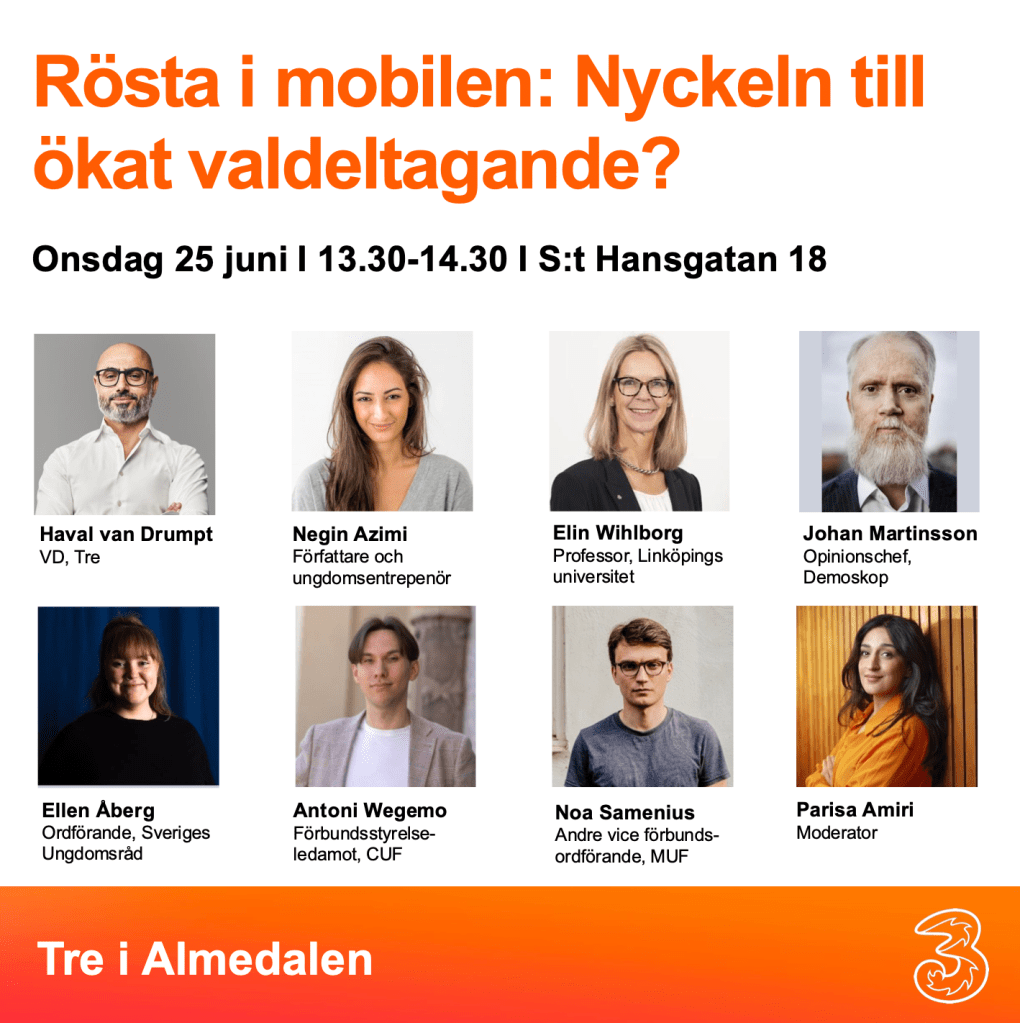 Nu på onsdag deltar jag i panelen ”Rösta med telefonen – nyckeln till ökat valdeltagande?”, arrangerad av Tre Sverige under Almedalsveckan.