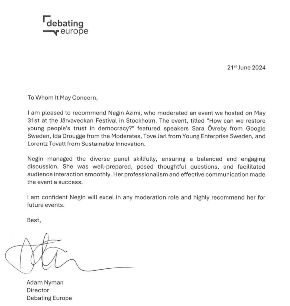 ”Företagarna arrangerade tävlingen Årets Unga Idé och vi anlitade Negin som programledare till deltävlingen i Stockholm 2024. Vi fick en fantastisk kväll, mycket tack vare Negin som ägde på scenen och fick med sig publiken, partners och våra pitchdeltagare med hög energi och proffsigt modererande.”